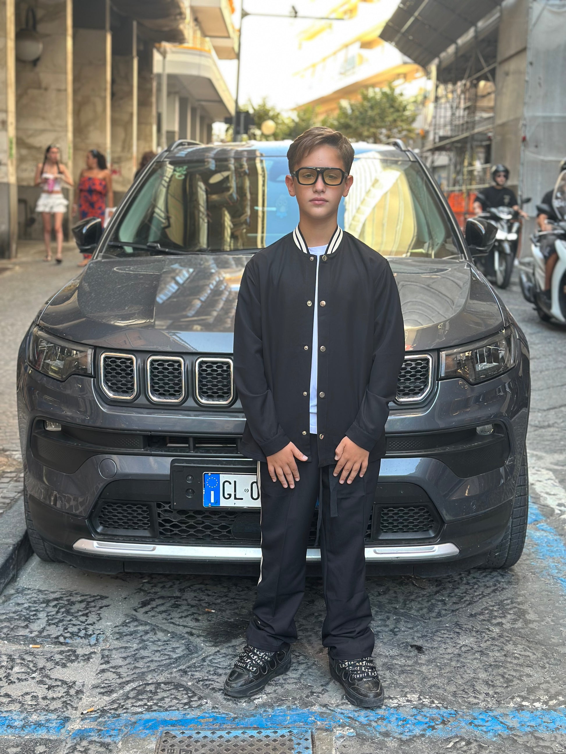 COORDINATO TUTA PRIMAVERILE THE BROTHERS BRAND COMPOSTO DA PANTALONE CON FASCE A RIELIEVO E GIACCA CON CHIUSURA CON BOTTONI IN ACCIAIO E COLLETTO CHE RICHIAMA IL PANTALONE.