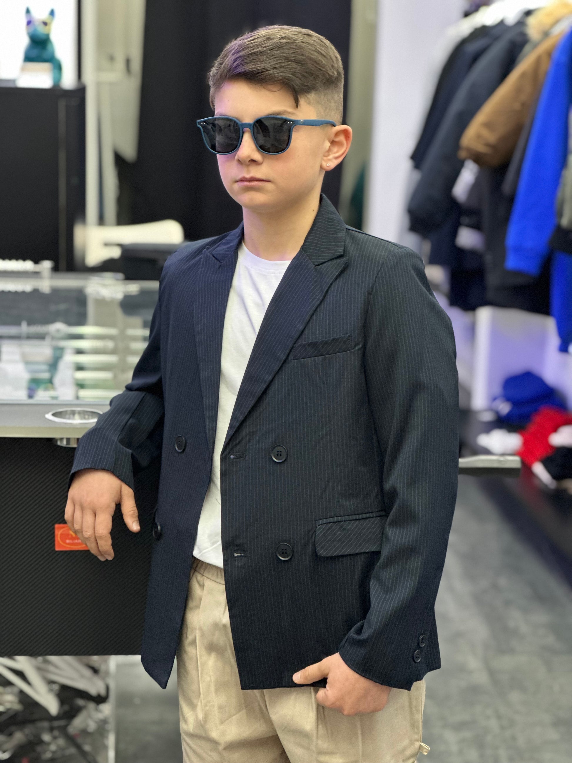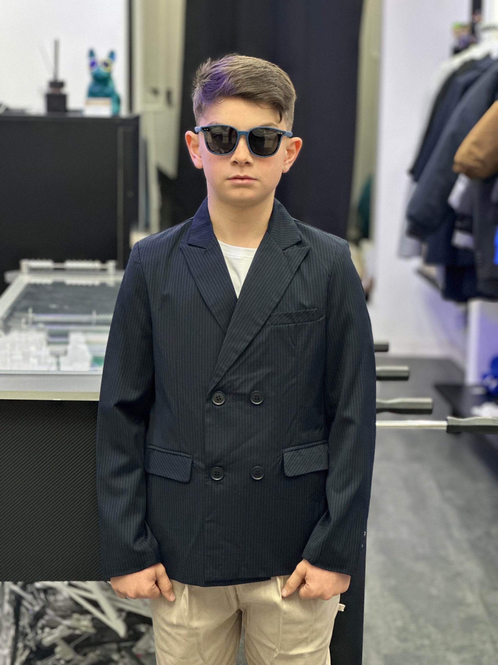 giacca blu doppio petto gessata, il capo che non puó mancare nel tuo guardaroba . Adatta per i tuoi outfit eleganti , ma perfetta anche da comporre outfit eleganti sportivi con una t-shirt