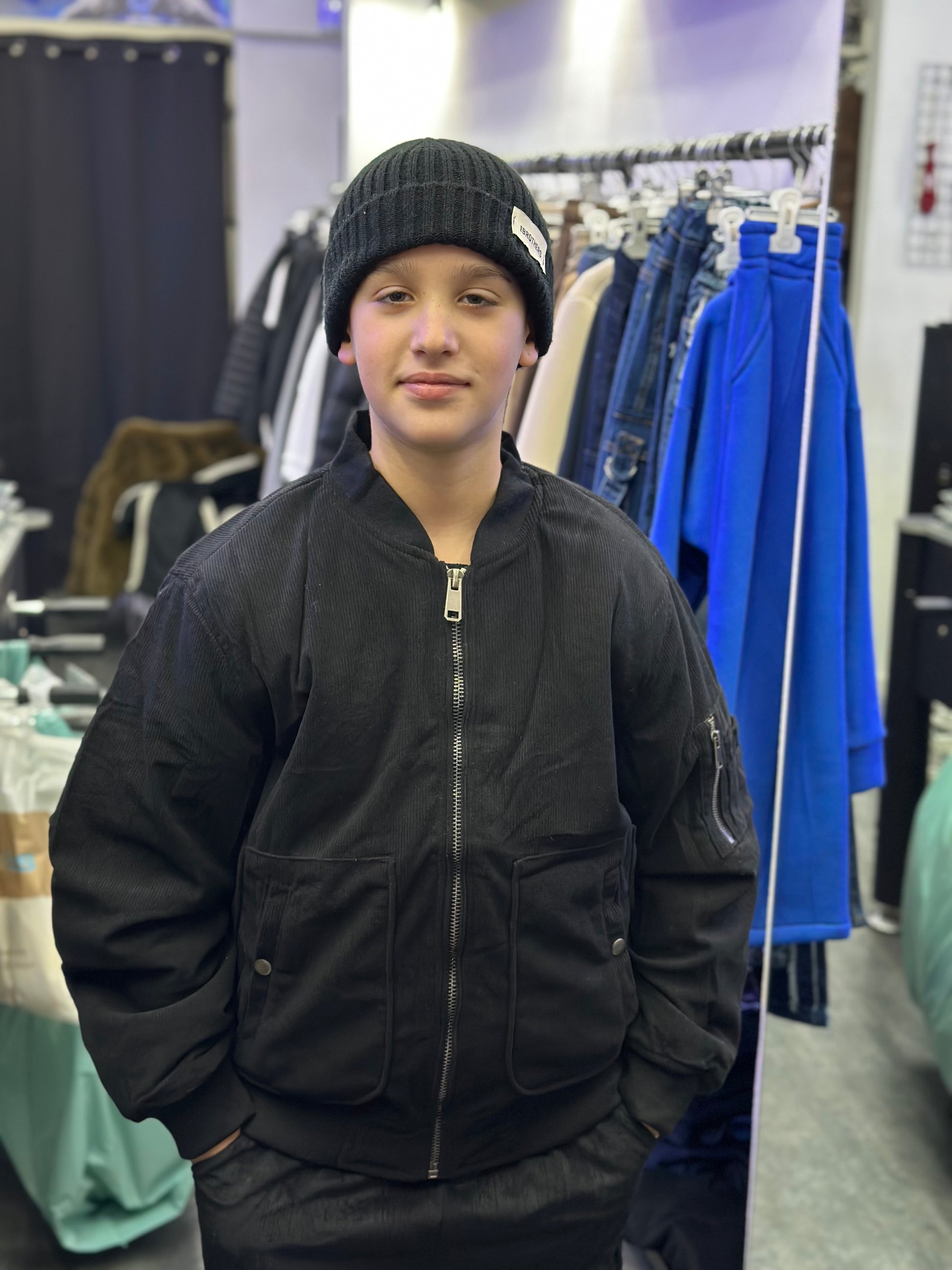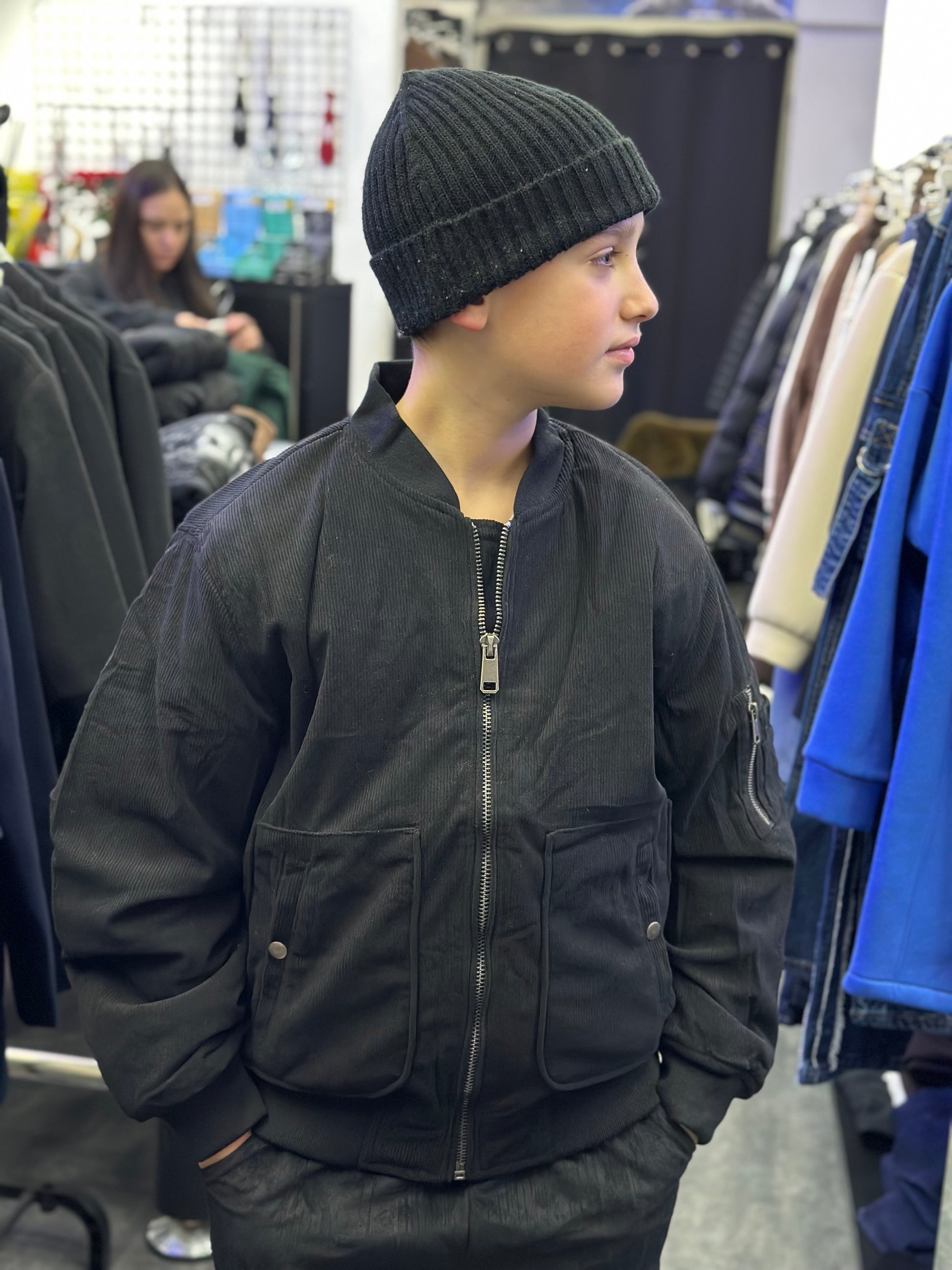 Giubbotto nero con tasconi a costine versatile e adatto a look sportivi o eleganti. Interno trapuntato per il massimo comfort e calore."